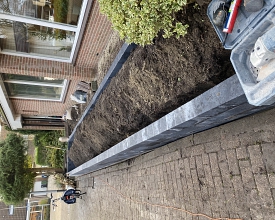 Een grote bloembak aangelegd met antraciet stapelblokken.