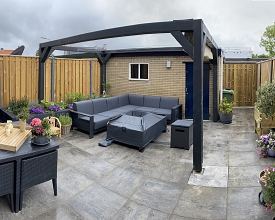 Bestrating en overkapping samen met de bloembak op de achtergrond. Een prachtig resultaat.