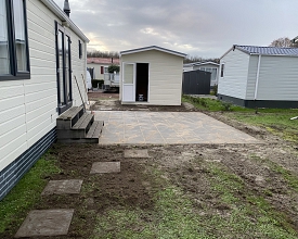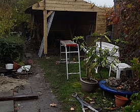 Het tuinhuisje verplaatst en 2 terrassen aangelegd bij een Chalet